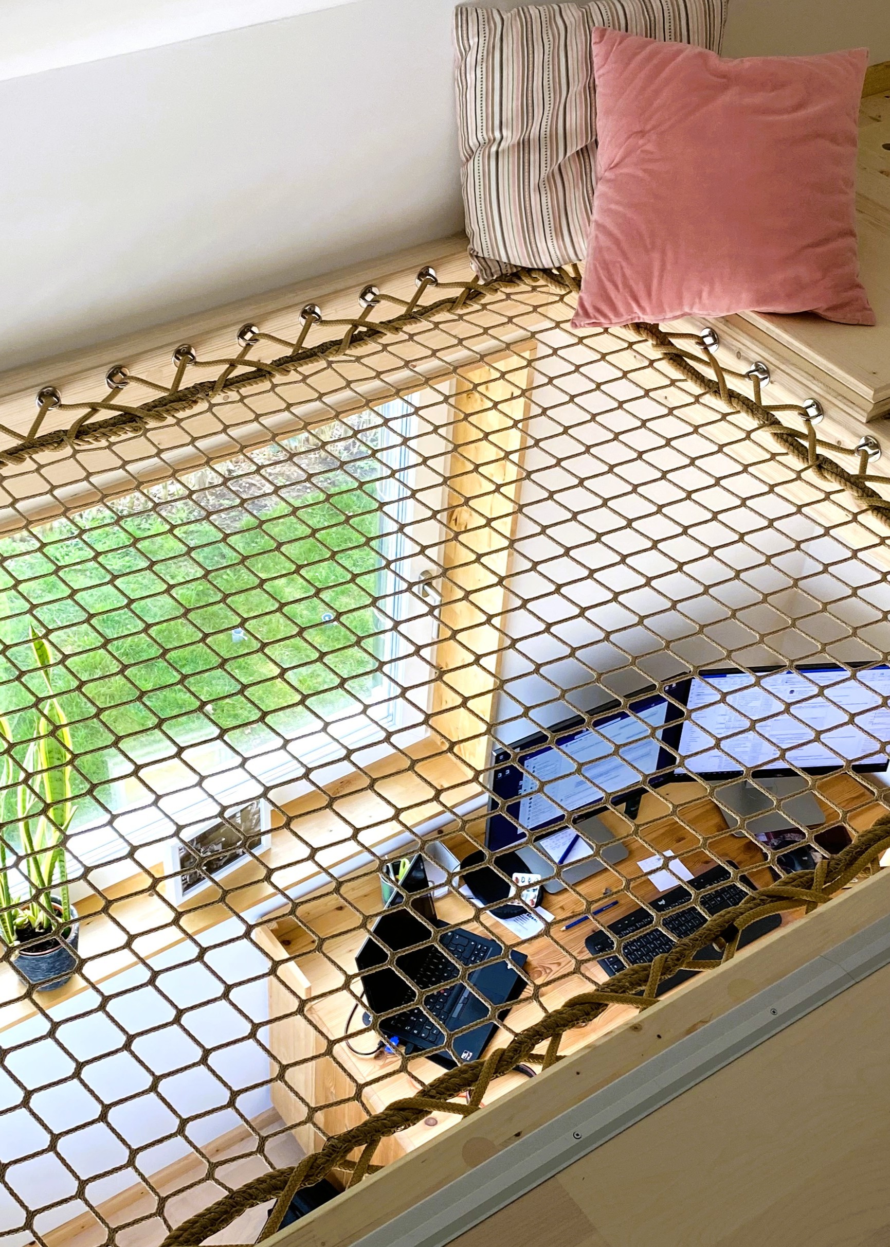 En usage horizontal, le filet d’habitation viendra prolonger élégamment une mezzanine sans la fermer avec un garde-corps classique. Il offre aussi un espace de détente original et ludique pour toute la famille, au-dessus du salon ou dans une chambre d’enfant.